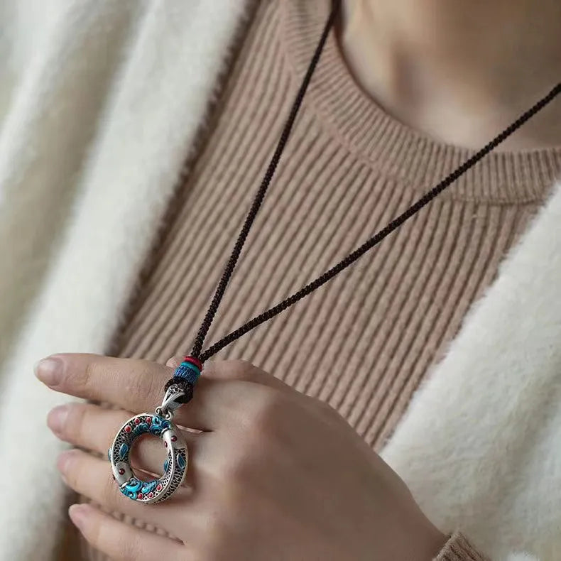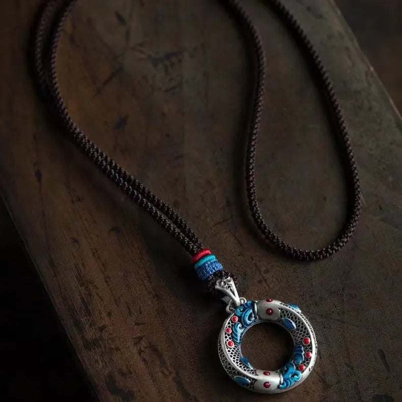 S925 Sterling Silver Cloisonné Koi Fish Peace Buckle Pendant Necklace - Retro Chinese Guochao Style, Lucky Attracting Jewelry Gift for Women